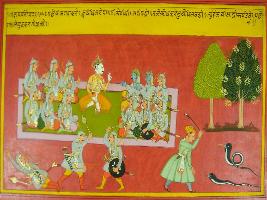 | Description / विवरण | Miniature painting based on Mahabharat - Gada parva depicting Vigorous fight between Bhim and Duryodhan depicting Duryodhan in furious mood as a hurted snake. |