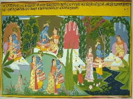 | Description / विवरण | Miniature painting based on Geet Govind depicting Krishna praising the beauty of Radha in a garden. |