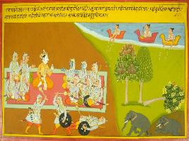 | Description / विवरण | Miniature painting based on Mahabharat - Gada parva depicting Duryodhan is falling on ground by attack of Bhim and Pandavas getting happy. Devlook are pouring flower from sky. |