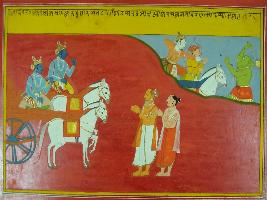 | Description / विवरण | Miniature painting based on Mahabharat - Adi parva depicting Krishna and Arjun on chariot and two sages standing in front of them. On the upper part a demon is depicted fighting with Krishna. |