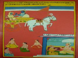 | Description / विवरण | Miniature painting based on Shri Bhagwat Gita. It depicts Krishna preaching Arjun that tradition can be followed like wise. Raj rishi know about yoga. Yoga can be learnt after a long time. |