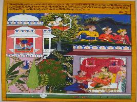 | Description / विवरण | Miniature painting based on Rasikpriya depicting at the upper right Krishna is sitting in a palatial balcony. At the lower left Radha is depicted sitting with her friends. Kamdev is depicted sitting on a tree with his bow and arrow and next to him three musicians are seen moving forward in a rainy day. |