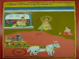 | Description / विवरण | Miniature painting based on Shri Bhagwat Gita. Arjun asking Krishna that you took birth long after the birth of Surya. How did you know about the story that yoga gave direct can to Surya sun . |