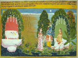 | Description / विवरण | Miniature painting based on Geet Govind depicting Krishna coming to meet Radha in the garden, in happiness, in the moon light. Radha is feeling shy by seeing Krishna in front of her and expressing her anger to him. A friend of Radha is seen with them. |