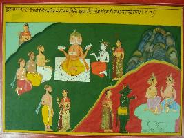 | Description / विवरण | Miniature painting based on Mahabharat - Adi parva depicting Tilotama, the apsara who enlighten the court of Indra, came to Brahma to take his blessings. Shiv and other sages are seen sitting around Brahma. The left corner depict sand, Upaskand are in conversation and a demon bring Tilotama towards them. |