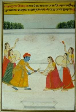 | Description / विवरण | Miniature painting depicting Falgun-Masa, where Sri Krishna is playing holy with Radha and other gopis are playing music. |