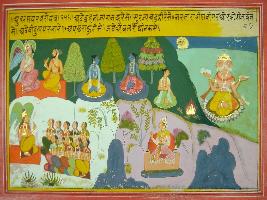 | Description / विवरण | Miniature painting based on Mahabharat - Udyam parva depicting Garuda is telling Galva about the glory of the place where, Brahma meditates and chants prayers and sun and moon moves. It is the place where Narayan was born 10 apsaras live. |