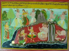 | Description / विवरण | Miniature painting based on Mahabharat - Adi parva depicting Skand and Upaskand enjoying dance. At that time Tilotama comes to them and by seeing her both brothers, quarrelled with each other. After that they started fighting with mace and at last died. |