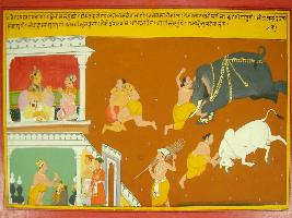 | Description / विवरण | Miniature painting based on Mahabharat - Virat parva depicting Virat king ask Bhim that what he will do Bhim, replies that his name is Vallabh and he will work as cook and fighter to entertain king. |