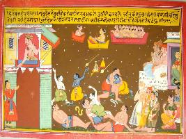 | Description / विवरण | Miniature painting based on Harivansha depicting Krishna and Balram wrestling with Chanur and Mustaka demons sent by Kansa. Devtas on the upper part and Nanda and other people at the left side are watching it. At the right side Kansa is depicted sitting on palatial balcony and talking to a man. |