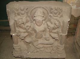 | Description / विवरण | It is a sculpture of ten armed goddess Chakreswari, shown in lalitasana on lotus, holding sword, shield, bow, arrow, drum, etc. in her arms. The goddess is shown worshipped by two flying celestial at top and base have two human female. |