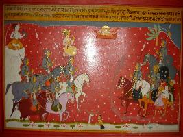 | Description / विवरण | Miniature painting based on Prithviraj Raso depicting by seeing the marching of Jaichand with his army the whole world start shaking and dust covers the sky. |
