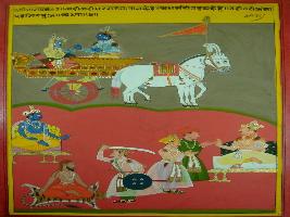 | Description / विवरण | Miniature painting based on Shri Bhagwat Gita. It depicts Krishna preaching Arjun that whenever Dharma faith is vanished then Adharam unfaith rises and then I take different Avatars. |