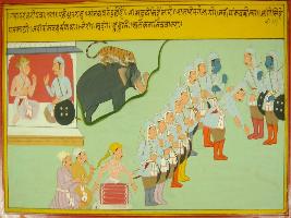 | Description / विवरण | Miniature painting based on Mahabharat - Gada parva depicting Dhritrashtra asking Sanjay about the result of war and Sanjay told him that as a lion get happy after killing elephants some way Bhim is getting happy after defeating Duryodhan. |