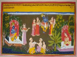 | Description / विवरण | Miniature painting based on Geet Govind depicting Jaidev sitting and talking to two men at lower middle part. Krishna is shown playing flute and surrounded gopis. At the right side, Krishna shown sitting and Radha s friend telling him about the grief of Radha. At the left side, Radha is shown sitting alone, thinking of Krishna. |