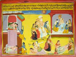 | Description / विवरण | Miniature painting based on Harivansha depicting assassination of Kansa by Krishna. The lower left corner depicts queens weeping on his dead body. The upper left part depicts Krishna and Balram meeting Vasudev. Nanda is also depicted with them. |