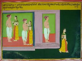 | Description / विवरण | Miniature painting based on Mahabharat - Virat parva. Bhim is depicted with Draupadi in the palace and they are embracing each other. |