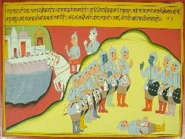 | Description / विवरण | Miniature painting based on Mahabharat - Gada parva depicting is Baldev moving towards Dwarika. Krishna asks Yudhistir that why he is worried after result of war. Bhim praise him and ask him to rule over Hastinapur. |