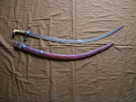 | Description / विवरण | It is a sword with a curved cutting edge, one side and the other side is flat with sharp cutting edge. It is a single piece sword and two ivory pieces attached on the hilt.Scabbard is covered with painted red leater. |