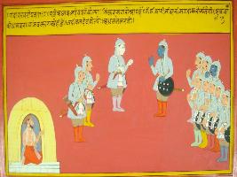 | Description / विवरण | Miniature painting based on Mahabharat - Gada parva depicting Krishna talking to Balram about Dharma and Adhasma to Kauravas. |