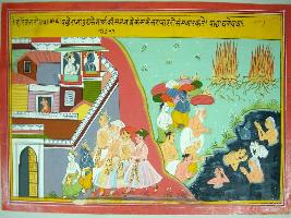 | Description / विवरण | Miniature painting based on Harivansha depicting Krishna-Balram with Raja Ugrasena on the right side entering into the city, while left side of painting depicts Kansa s cremation and men taking bath after it. |