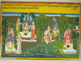 | Description / विवरण | Miniature painting based on Geet Govind depicting gopis touching feet of Krishna on left side and telling him about their Virah , the pain of separation from him. In right part, pain of separation of Krishna as well as of Radha is depicted. |