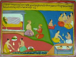 | Description / विवरण | Miniature painting based on Harivansha depicting Bhishma with Yudhisthir in the centre of the painting. Bhishma depicted telling Yudhisthir that for getting place in heaven for his father, performance of Shradh is essential. |