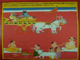 | Description / विवरण | Miniature painting based on Shri Bhagwat Gita. It depicts Krishna preaching Arjun that one should perform his own Karma without expecting the result. |