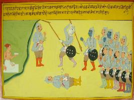 | Description / विवरण | Miniature painting based on Mahabharat - Gada parva depicting Yudhisthir crying on death of Duryodhan and Baldev is getting furious over Bhim as he break the rules of mace war. |
