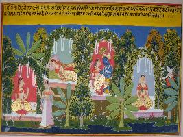 | Description / विवरण | Miniature painting based on Geet Govind depicting holy union of Krishna and Radha. Kamdev is depicted aiming flower arrow to Radha. |