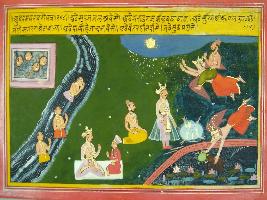 | Description / विवरण | Miniature painting based on Mahabharat - Udyam parva. It depicts, Garuda is telling Galva glory of a place where water falls down due to sun, Garuda save elephant and tortoise and Kapila sage born from sun god but knowhn as son of king Sagar. Here people get rid of sins by faking bath in Vaitarni river, which flows here. |