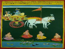 | Description / विवरण | Miniature painting based on Shri Bhagwat Gita. It depicts Krishna preaching Arjun about Karma and Akarma. He says that one who knows about Karma will attain Moksha . |