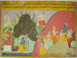 | Description / विवरण | Miniature painting based on Geet Govind depicting Krishna with Radha on right part of painting, under a Kadamba tree. In left part, Krishna with Indra and other gods and demons are depicted. |