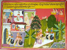 | Description / विवरण | Miniature painting based on Harivansha depicting some scenes of Mathura, Devki and Vasudev, Ugrasena, and Balram and Krishna are seen. king Ugrasena is sitting with Krishna and Balram outside and then they all are entering in the city of Mathura. While three Devtas in viman are seen in the upper left side. |