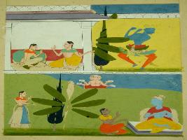 | Description / विवरण | Miniature painting based on Rasikpriya Probably depicting Radha with messenger and Krishna in dancing pose, respectively from right to left in the upper part. At the lower part Radha s message of love is provided to Krishna. At the central part Brahma is depicted. The painting is incomplete. |
