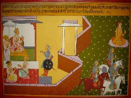 | Description / विवरण | Miniature painting based on Prithviraj Raso depicting Ravan telling king Jaichand about the bravery of the army of Prithviraj and his commanders. |
