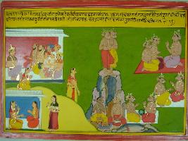 | Description / विवरण | Miniature painting based on Mahabharat - Adi parva depicting many Devrishi, Brahma rishi and Narad are shown sitting and talking to Yudhisthir. Draupadi are coming to them and touches their feet. Then Narad pointed Draupadi and told about a story of three sons of Kashayap rishi performing penance. |
