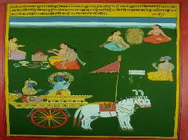 | Description / विवरण | Miniature painting based on Shri Bhagwat Gita. It depicts Krishna preaching Arjun that one who perform yagna would get Nectar and Sanatan Brahma. Those who don t perform yagna, would go to Adhamlok. |