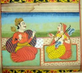 | Description / विवरण | Miniature painting depicting a king seated on couch with mace in hand and listening to music played by a woman in front of him with veena in her hands. |
