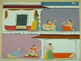| Description / विवरण | Miniature painting based on Rasikpriya depicting Radha suffering from the intensity of love for Krishna and not enjoying anything in the palatial balcony in the moon light while in the lower row Krishna is asking forgiveness from her. It is an incomplete painting. |
