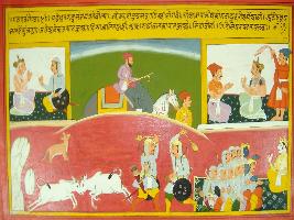 | Description / विवरण | Miniature painting based on Mahabharat - Gada parva depicting Dhritrashtra telling Sanjay that his son who will rule the whole world is going for Gada Yudha today, Bhim and Duryodhan are fighting as if two bulls are fighting. Due to their fight fackles started falling and meteriores are falling from the sky. |