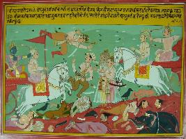 | Description / विवरण | Miniature painting based on Mahabharat - Virat parva depicting Arjun killed many soldiers of Kauravas. Jackles, cows are eating the fleshes of men and animals died in the battle. Two Kaurava soliders are asking for marcy to Arjun. |