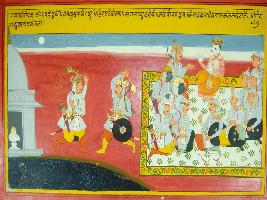 | Description / विवरण | Miniature painting based on Mahabharat - Gada parva depicting the fight between Bhim and Duryodhan. At the left side Balram is talking with Pandavas and Krishna. Sons of Draupadi are also seen with them. Moon and starts are seen in the sky. |