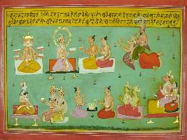 | Description / विवरण | Miniature painting based on Mahabharat - Udyam parva depicting Garuda carrying Galva and showing eastern direction where Brahma recited Vedas, Surya meet Savitri, Brahma gives Veda to Brahmans, gods performed yagna in order to gain nector and Agni lives. |