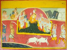 | Description / विवरण | Miniature painting based on Mahabharat - Gada parva depicting Krishna Pandvas and their sons are in conversation with Balram. At the lower left Duryodhan and Bhim is fighting in the way two bulls or two elephants fight with each other. At the lower right a king fighting with a demon. |