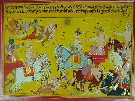 | Description / विवरण | Miniature painting based on Mahabharat - Virat parva depicting Arjun fighting and cut off the armour and body of many soliders and horses with his arrows. Many soldiers fall down on groung arrows. Many soldiers fall down on ground. In this way Arjun vigorously fighting with the Kauravas. |