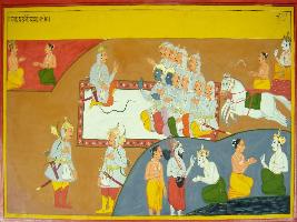 | Description / विवरण | Miniature painting based on Mahabharat - Gada parva depicting at the lower right Balram praying respect to Narad. Towards it right Bhim and Duryodhan is depicted standing face to face for fight. The upper part depict arrival of Balram and Krishna and other Pandavas with their sons listening to Yudhisthir. |