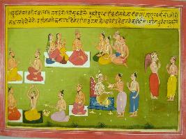 | Description / विवरण | Miniature painting based on Mahabharat - Udyam parva. Its depicts Garuda is telling Galva about eastern direction where Dharma raj performed yagna, Kashayap procreate Devta and demons and Indra was coronated as lord of god. |