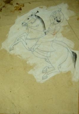 | Description / विवरण | Miniature portrait of a king depicting riding on horse. He is facing back and holding the rein with right hand and a spear with left hand. It is an unfinished painting. |