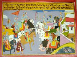 | Description / विवरण | Miniature painting based on Harivansha depicting the army of Jarasandha, king of Mathura and the army of Krishna and Balram standing in front of each other outside the Mathura city. |